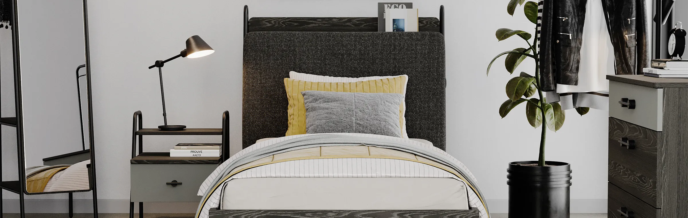The Arwen Youth Room blends the bold edge of metal and black glass with the balance of gray, making it the perfect choice for those who want to express their style through every detail.